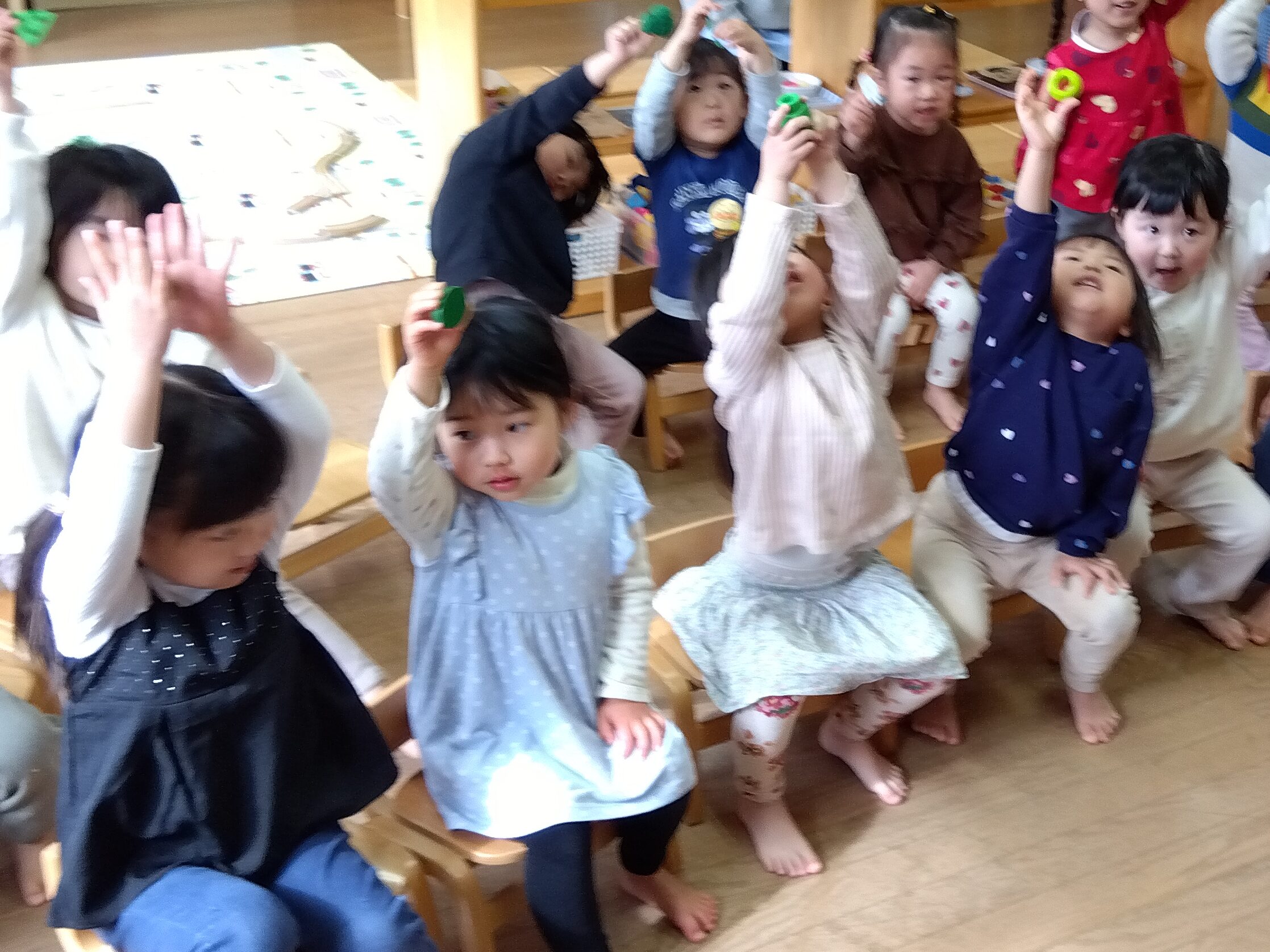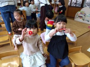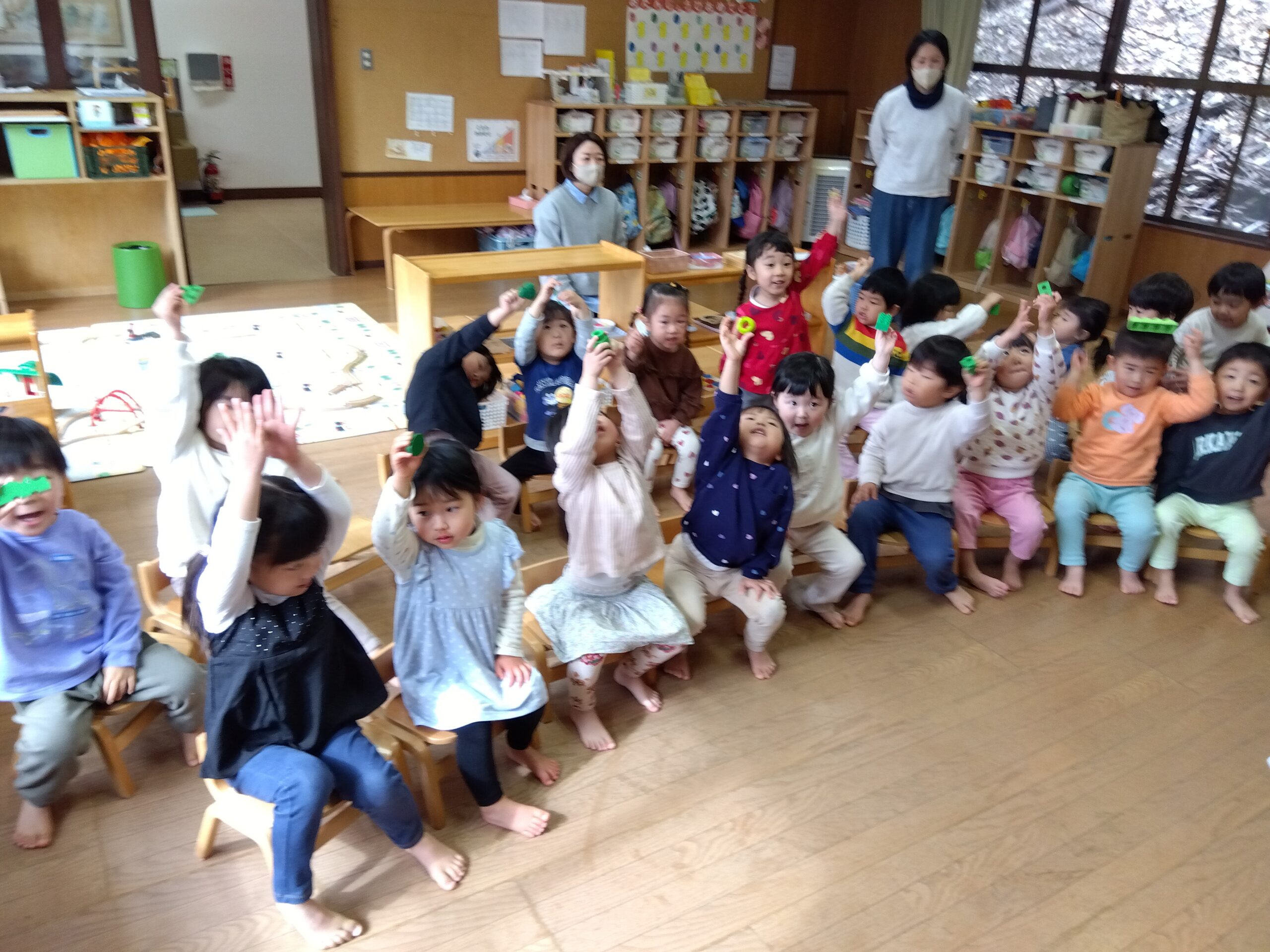 「みんなにもよく見えるように手を高く上げて見せてね」と言うと、みんな「見て!」と言いながらうれしそうに手を上げて見せてくれました。