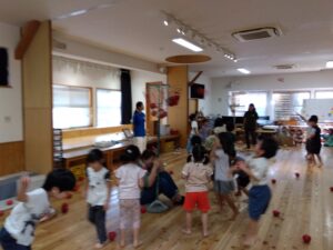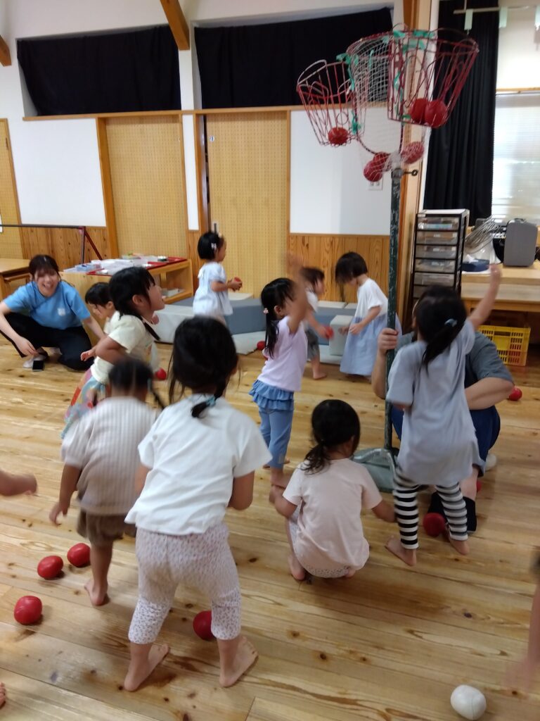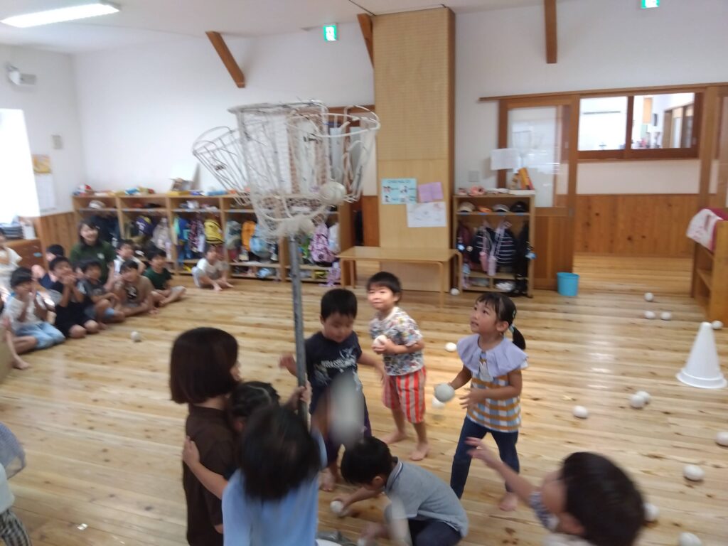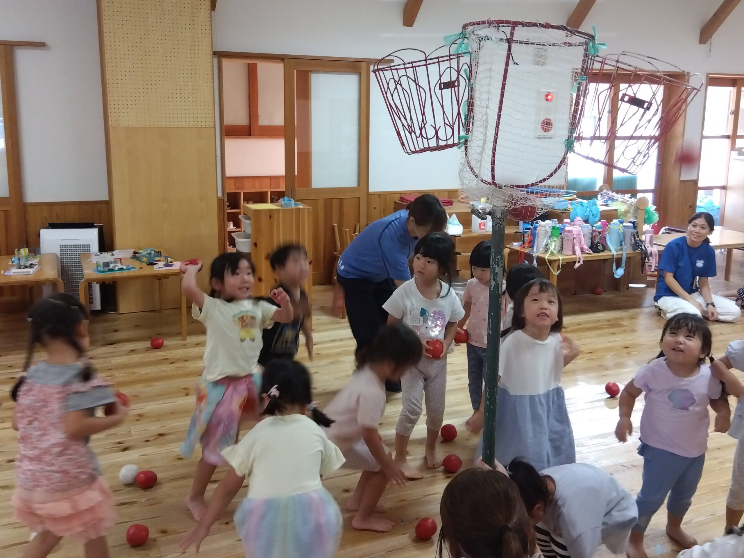 ヨーイドンの合図で、カゴに投げ入れますが、初めてなのでなかなか入らず…それでも何度も投げるうちに少しずつカゴに玉が入っていき、嬉しそうな子どもたちでした。