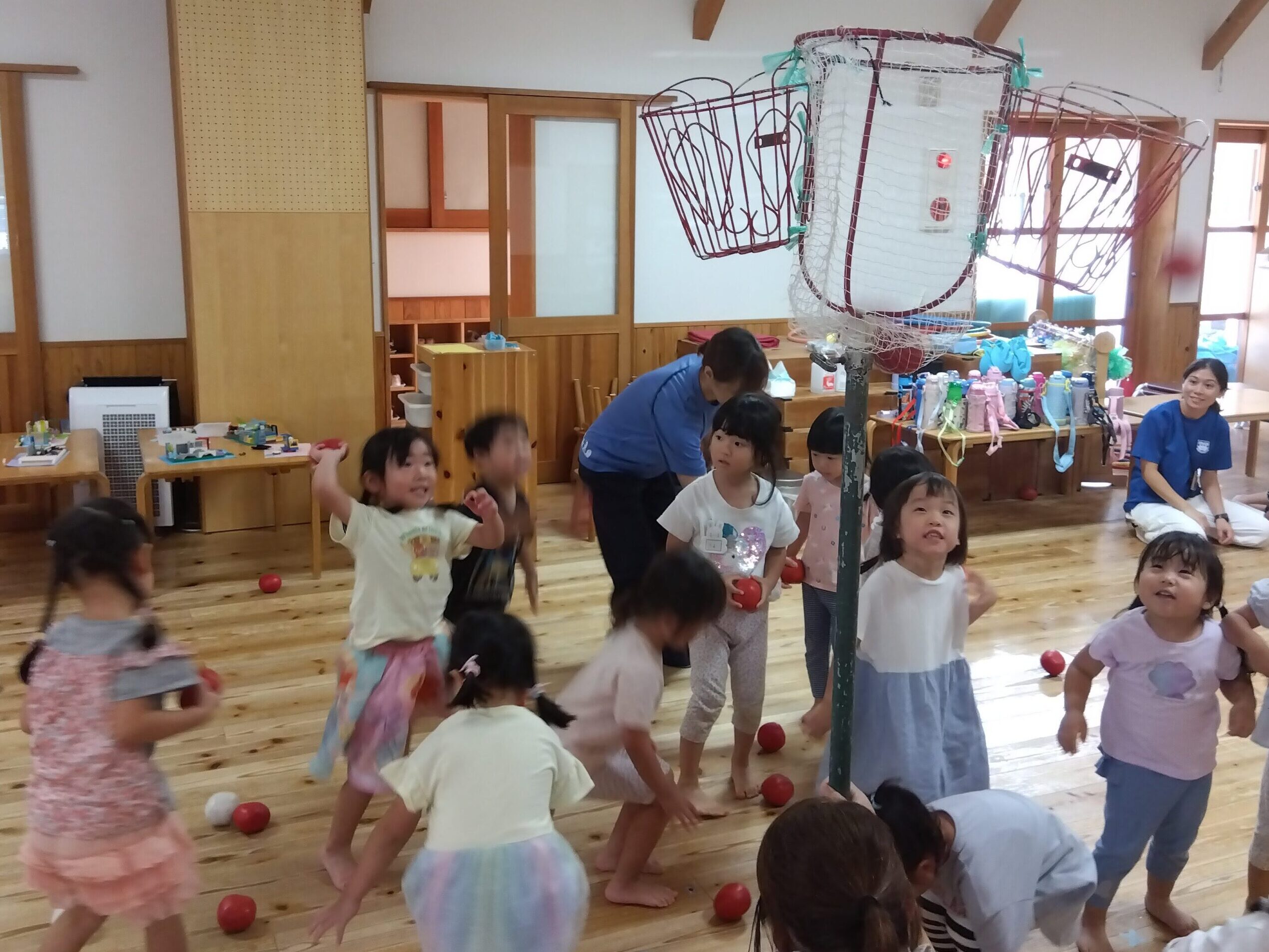 ヨーイドンの合図で、カゴに投げ入れますが、初めてなのでなかなか入らず…それでも何度も投げるうちに少しずつカゴに玉が入っていき、嬉しそうな子どもたちでした。
