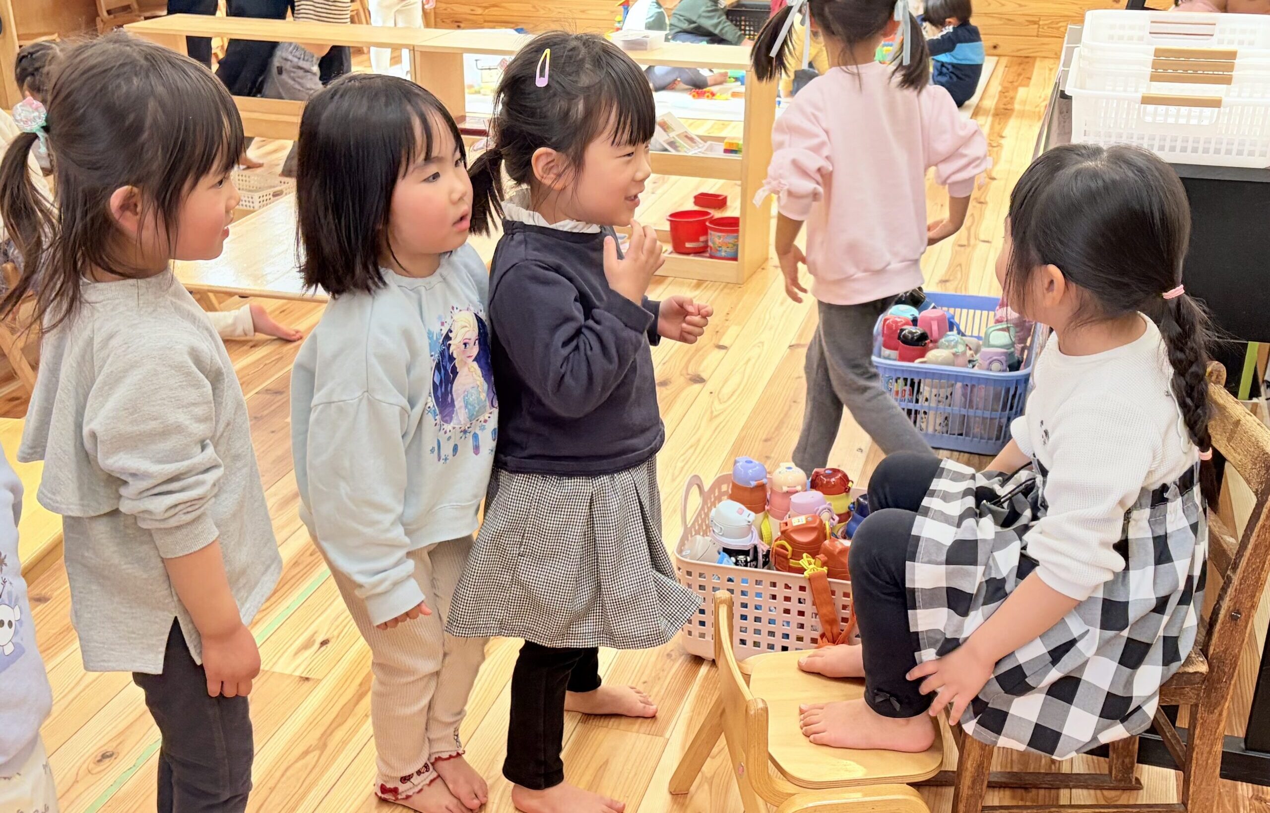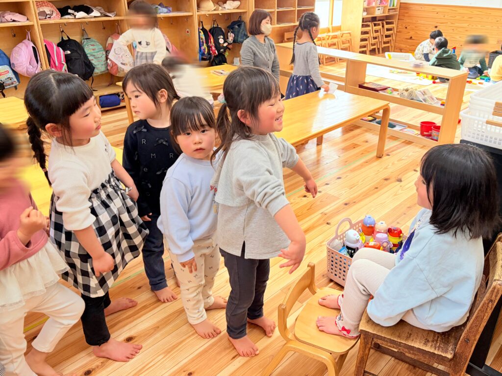 今日、自由遊び中にふと部屋を見渡すと、子どもたち同士で遊びを広げている場面がたくさんありました。