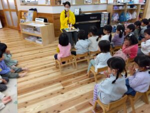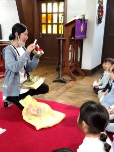 子どもたちはとてもよく話を理解しており、次の話をする際には、前回の話について振り返りを行なっていますが、「ヨセフさんとマリアさんに天使さんは何て言ったんだっけ?」「イエス様はなんで馬小屋でお生まれになったんだっけ?」と問いかけると「天使さんが、赤ちゃんが生まれるよって言ったんだよ」「ホテル(やどや)がいっぱいで泊まれなかったからだよ」と口々に教えてくれました。