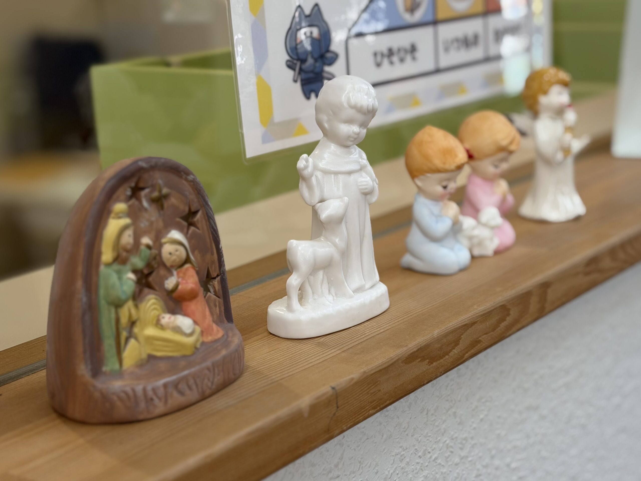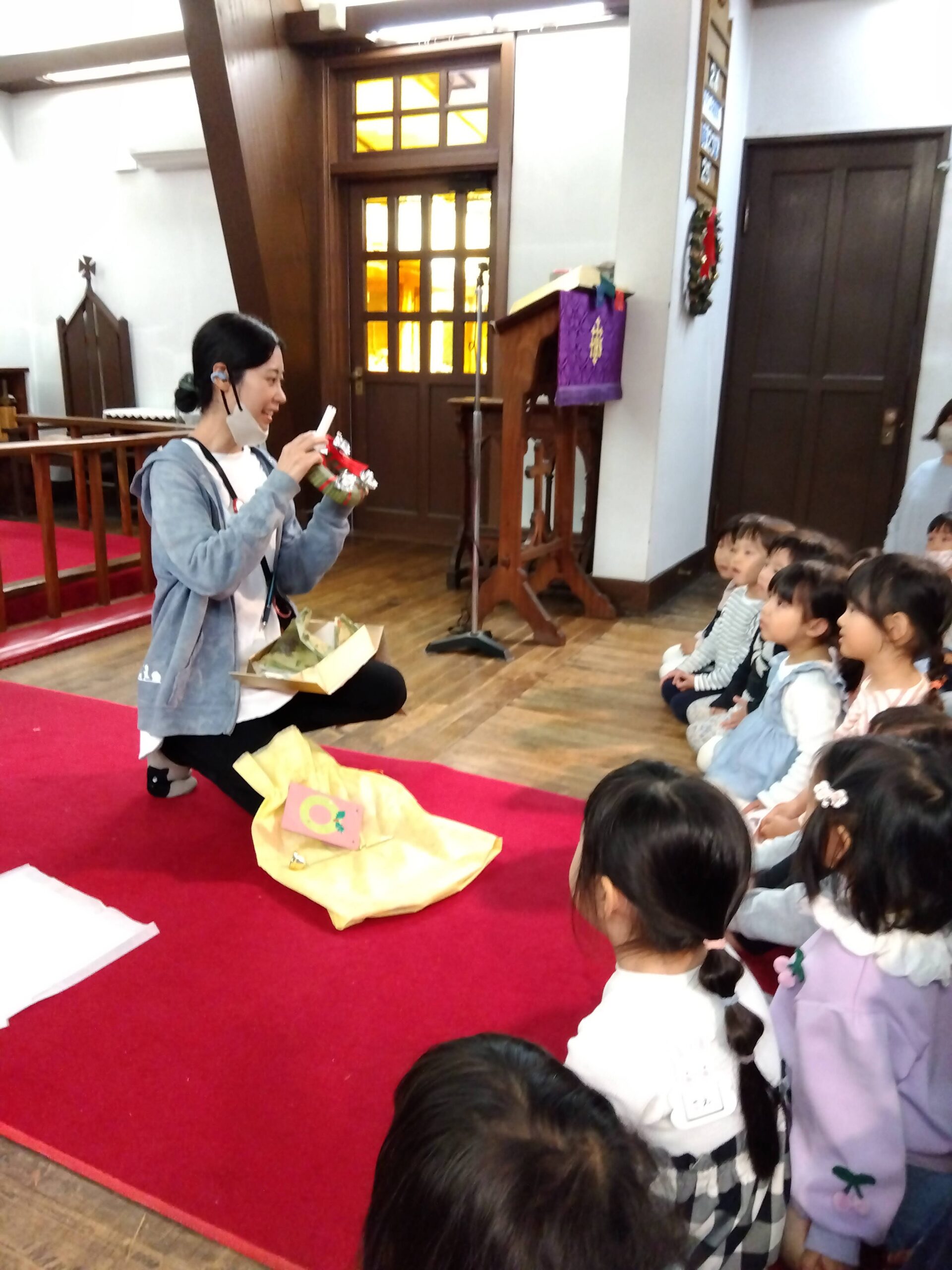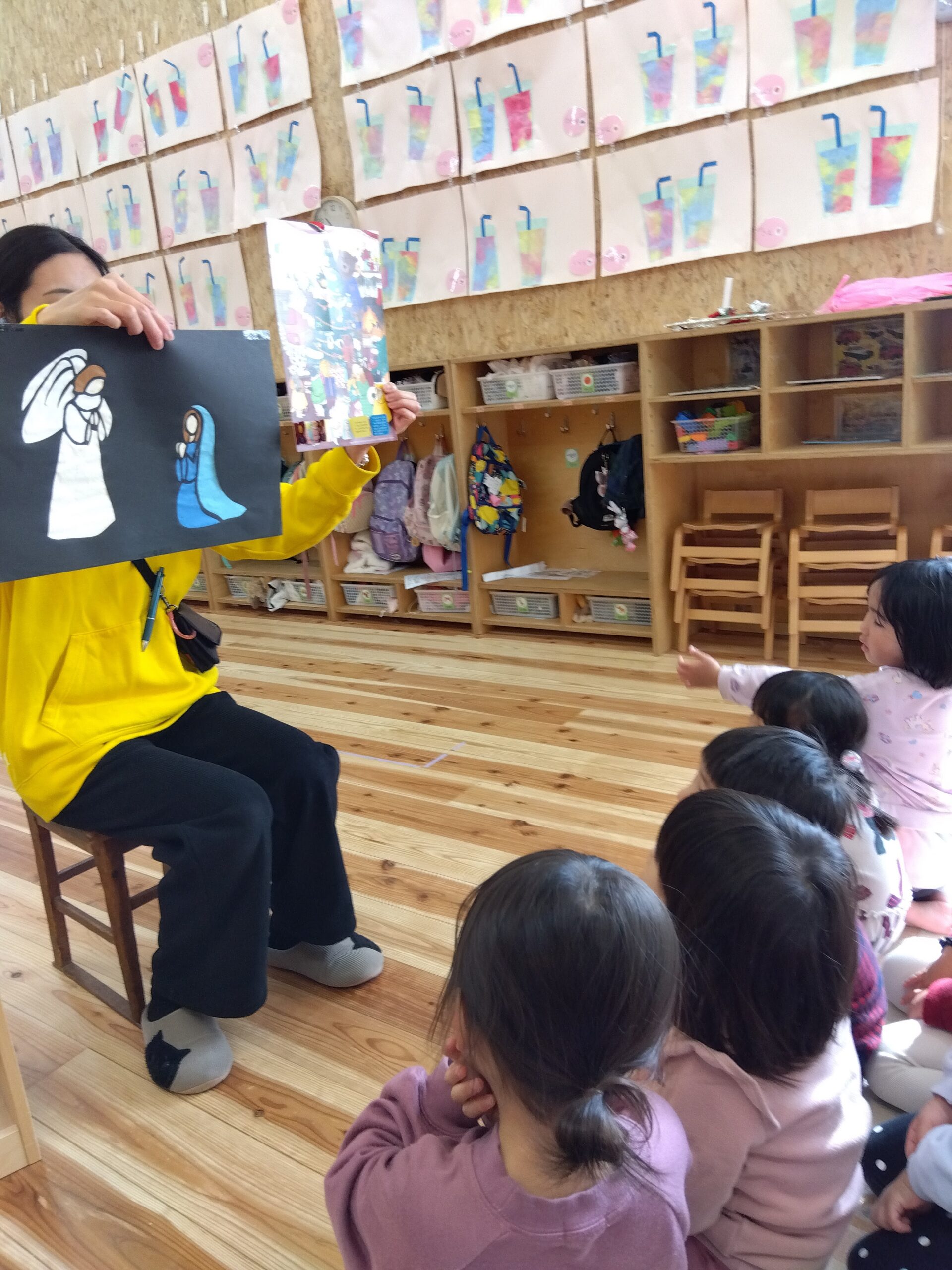 子どもたちはとてもよく話を理解しており、次の話をする際には、前回の話について振り返りを行なっていますが、「ヨセフさんとマリアさんに天使さんは何て言ったんだっけ?」「イエス様はなんで馬小屋でお生まれになったんだっけ?」と問いかけると「天使さんが、赤ちゃんが生まれるよって言ったんだよ」「ホテル(やどや)がいっぱいで泊まれなかったからだよ」と口々に教えてくれました。