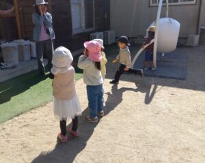 始めは数人が集まっていたのに、音楽が鳴り始めると自然と集まり、遠くにいても踊ったり、ポーズを決め手いました。お兄さん、お姉さんの姿をたくさん見せてくれたうさぎ組でした。