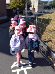 こないだお芋掘りに行った時にはまだ稲がたくさんあり、「おこめができてるんだよ」と話をしていた田んぼは稲刈りを終え、全く違う風景に子どもたちもびっくりしていました。