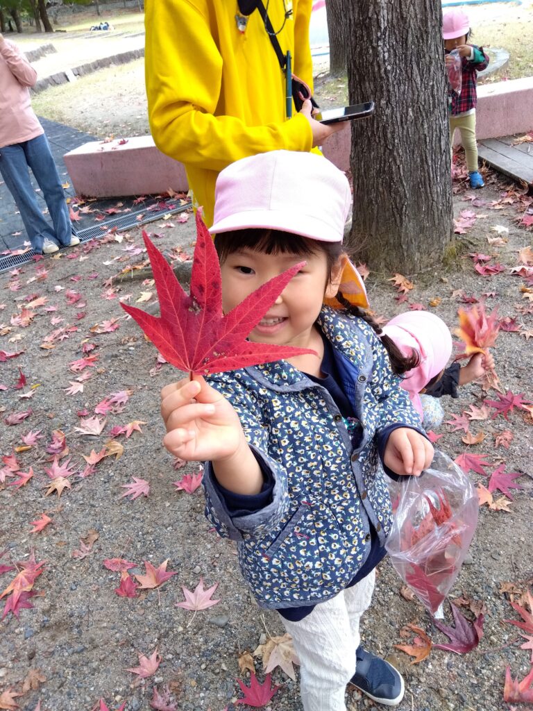 綺麗に葉っぱが紅葉しており、「みて真っ赤だよ!」「こんな大きいの見つけた!」とたくさん集めていました。