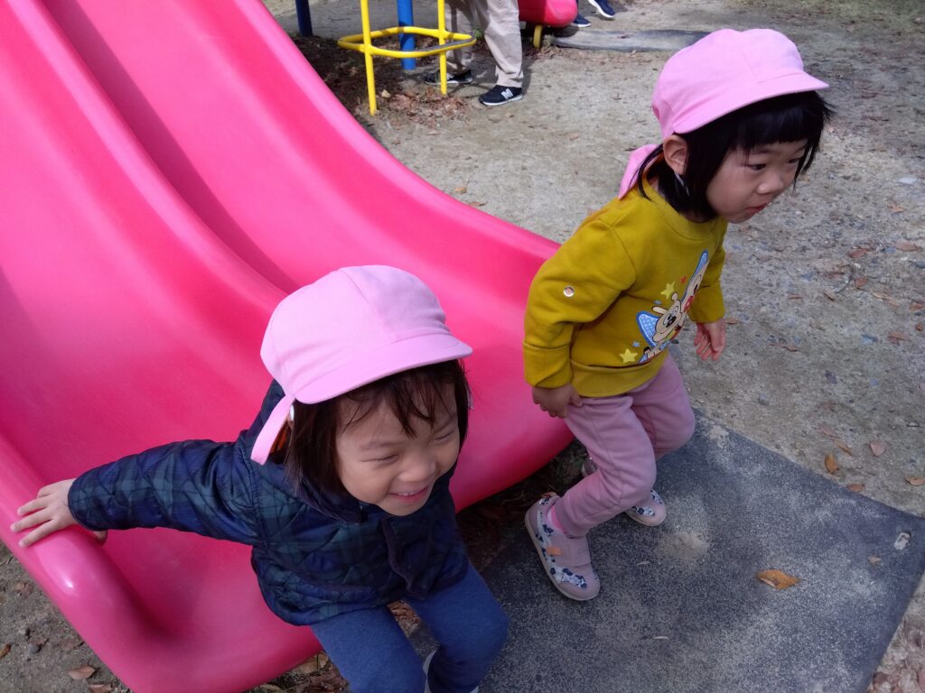 その後、小さな滑り台や汽車で遊び、あっという間におやつの時間です。