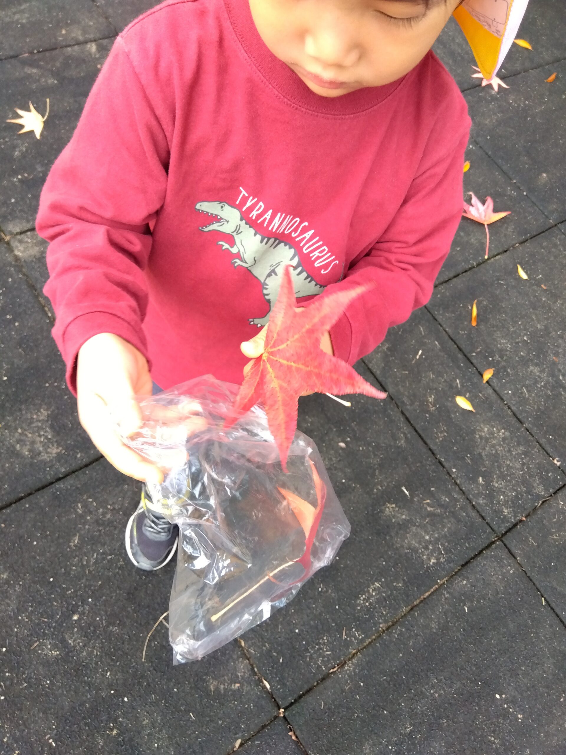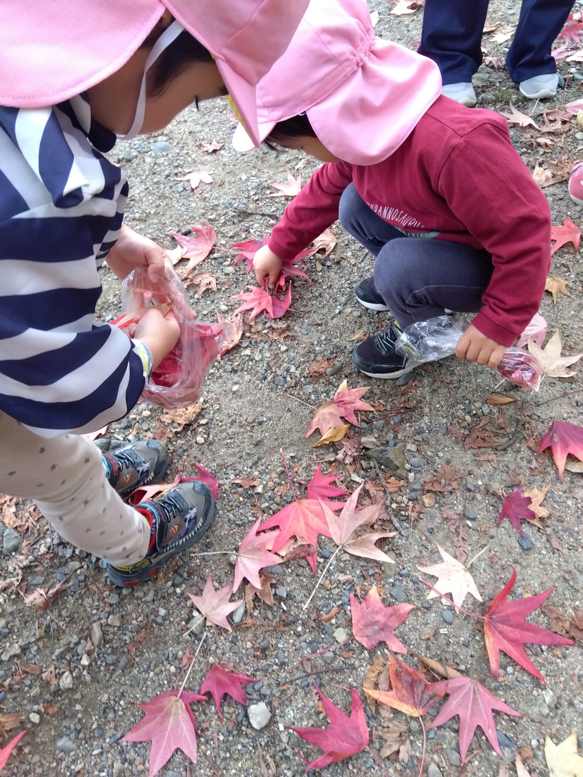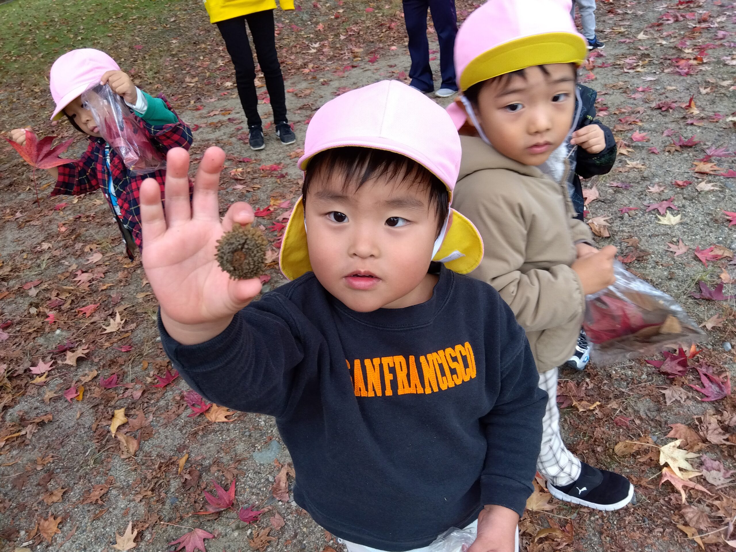 綺麗に葉っぱが紅葉しており、「みて真っ赤だよ!」「こんな大きいの見つけた!」とたくさん集めていました。
