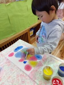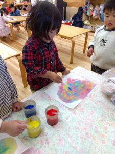 赤・青・黄の色水をスポイトで和紙に垂らし、グラスにストローを貼り、美味しそうなジュースを作っています。