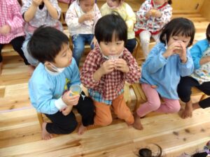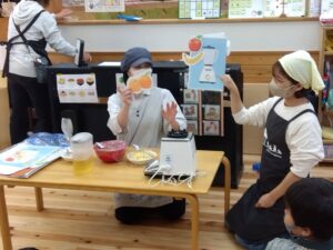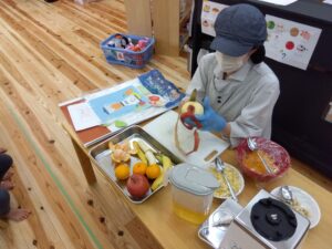 次に果物を実際に触り、匂いを嗅ぎ、「いいにおい〜」とわくわく。