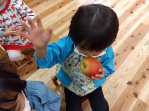 まずは、今回使う果物の皮を剥いてみたり、断面をみたりしました。りんごは大山先生がなが〜く皮を剥いてくださりみんな、「ヘビみたい!」「すごい〜!」と大歓声。