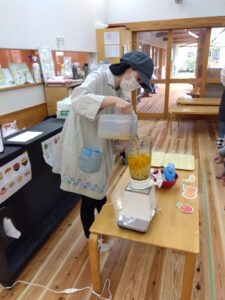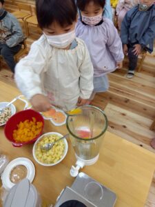 それぞれ好きな果物をスプーンで一杯。だんだん増えていきます。