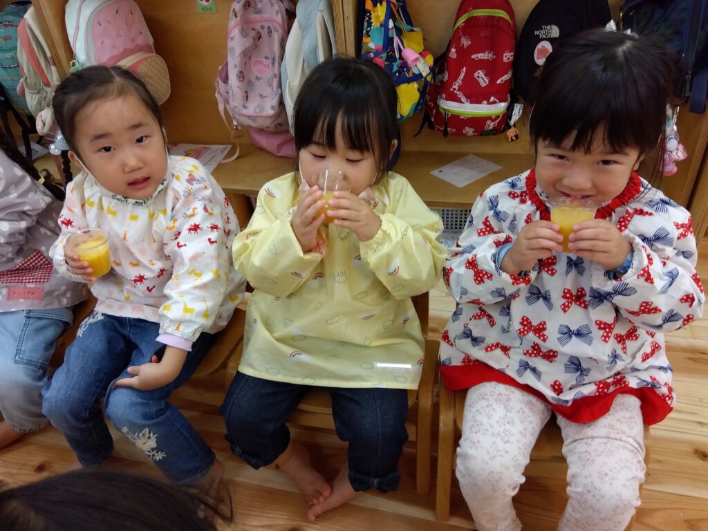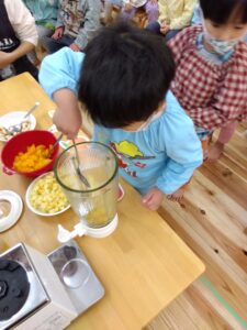 みんなでいつも歌っている「ぼくのミックスジュース」の歌を歌いながら自分たちの手もぐるぐると回して応援し、完成しました♪