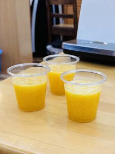 今回の材料は、バナナ、りんご、みかんの3種類のフルーツと、リンゴジュース。