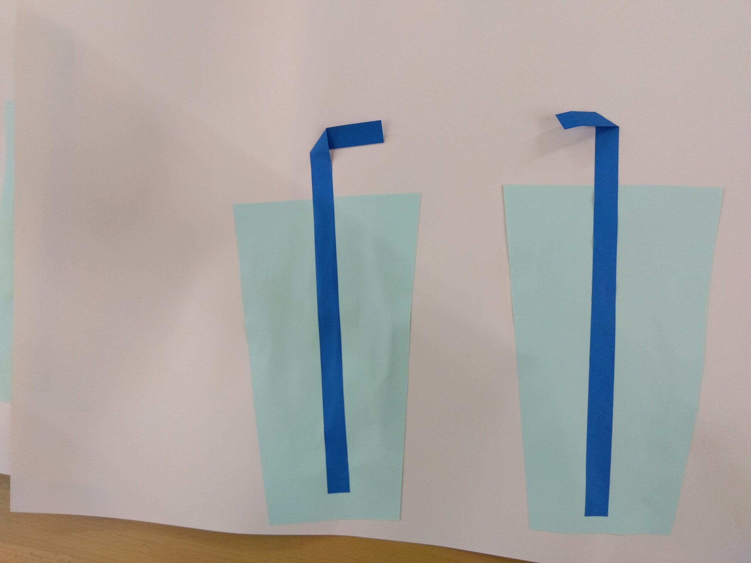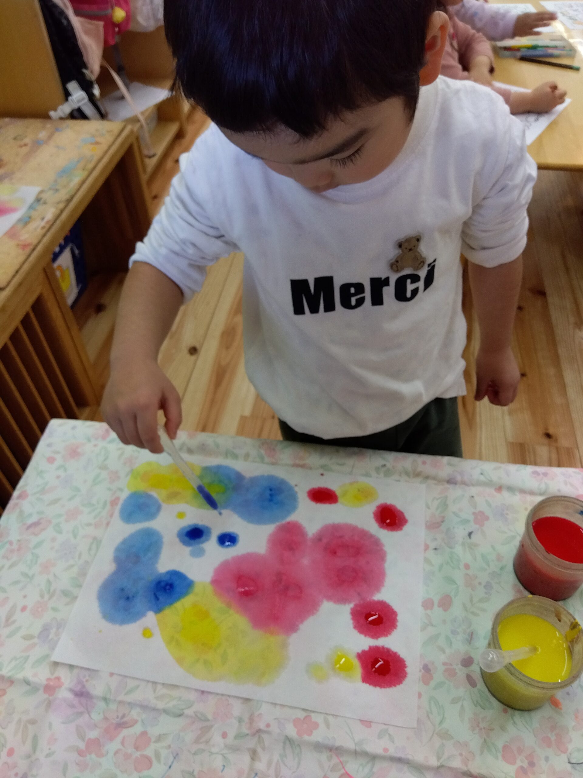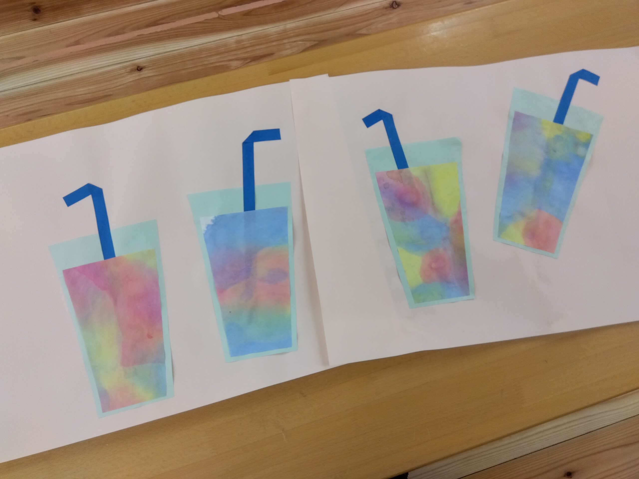 赤・青・黄の色水をスポイトで和紙に垂らし、グラスにストローを貼り、美味しそうなジュースを作っています。