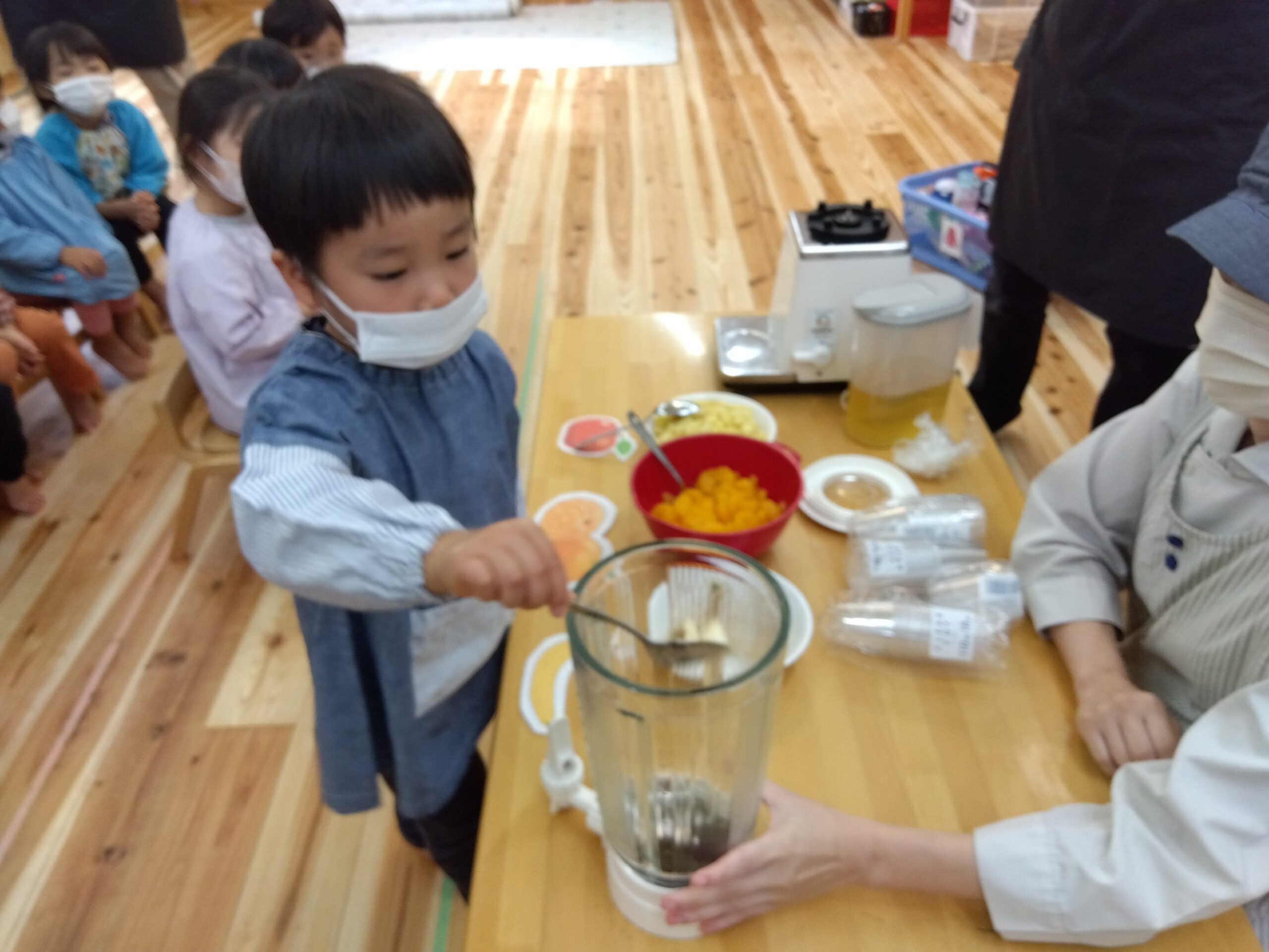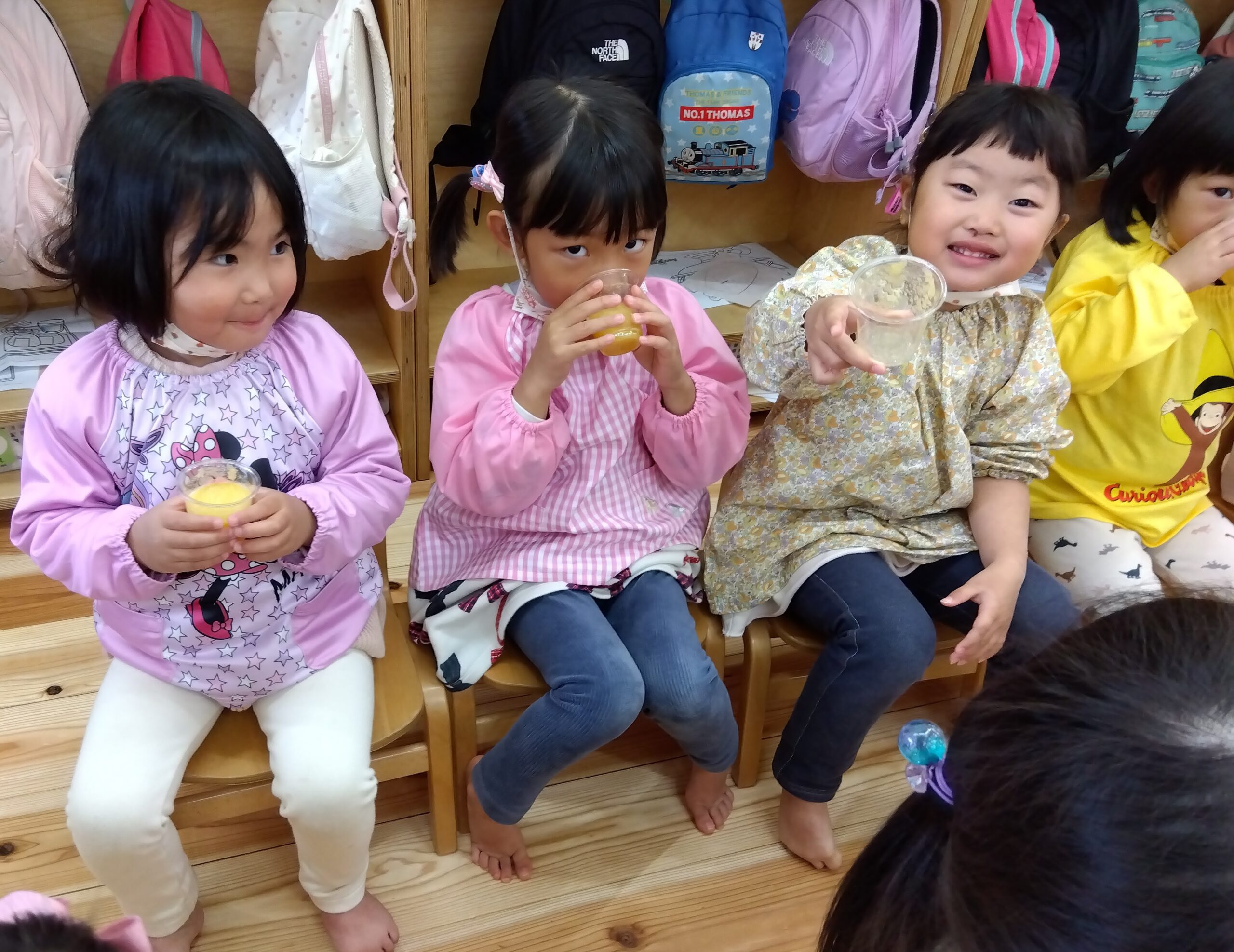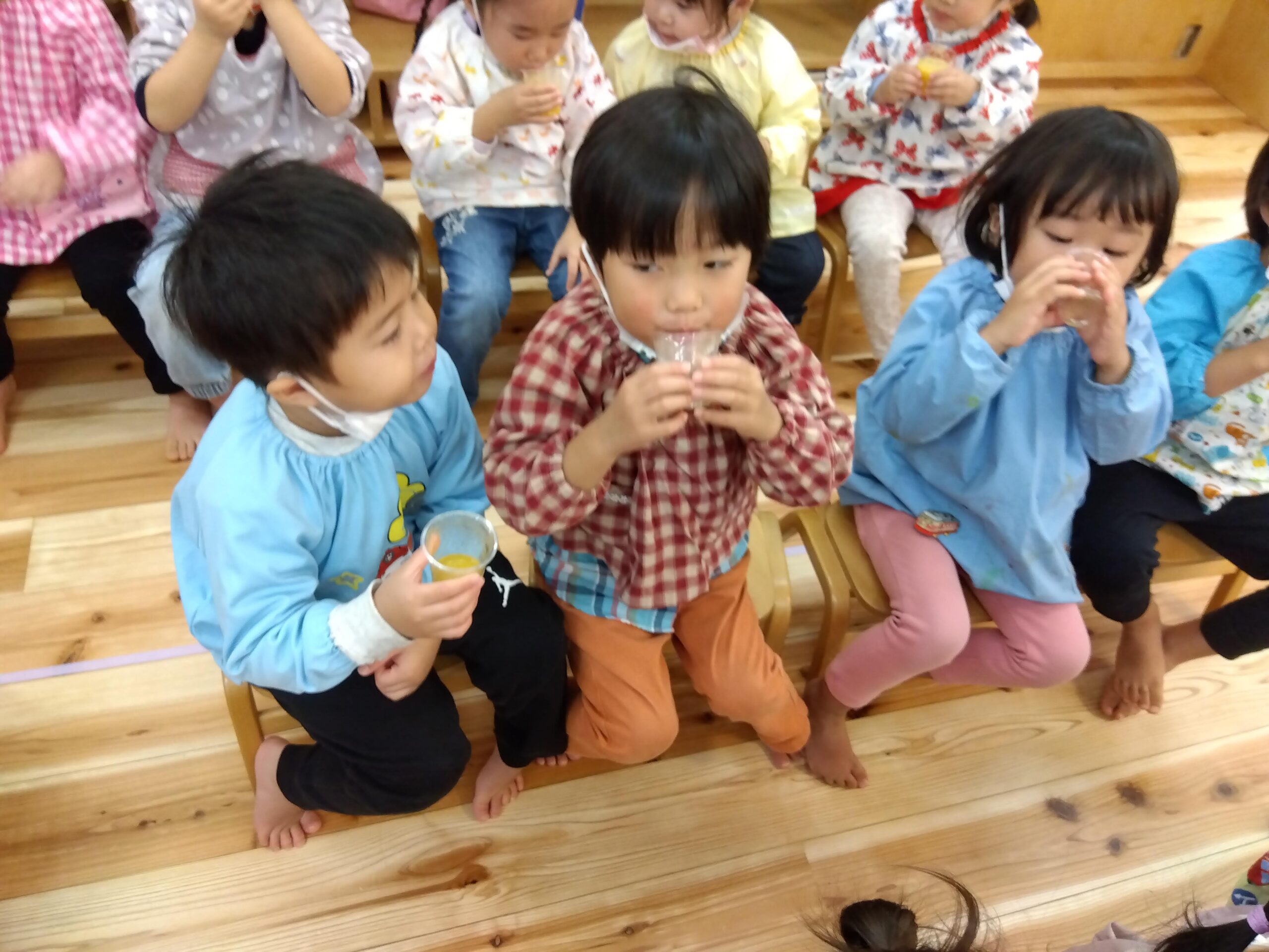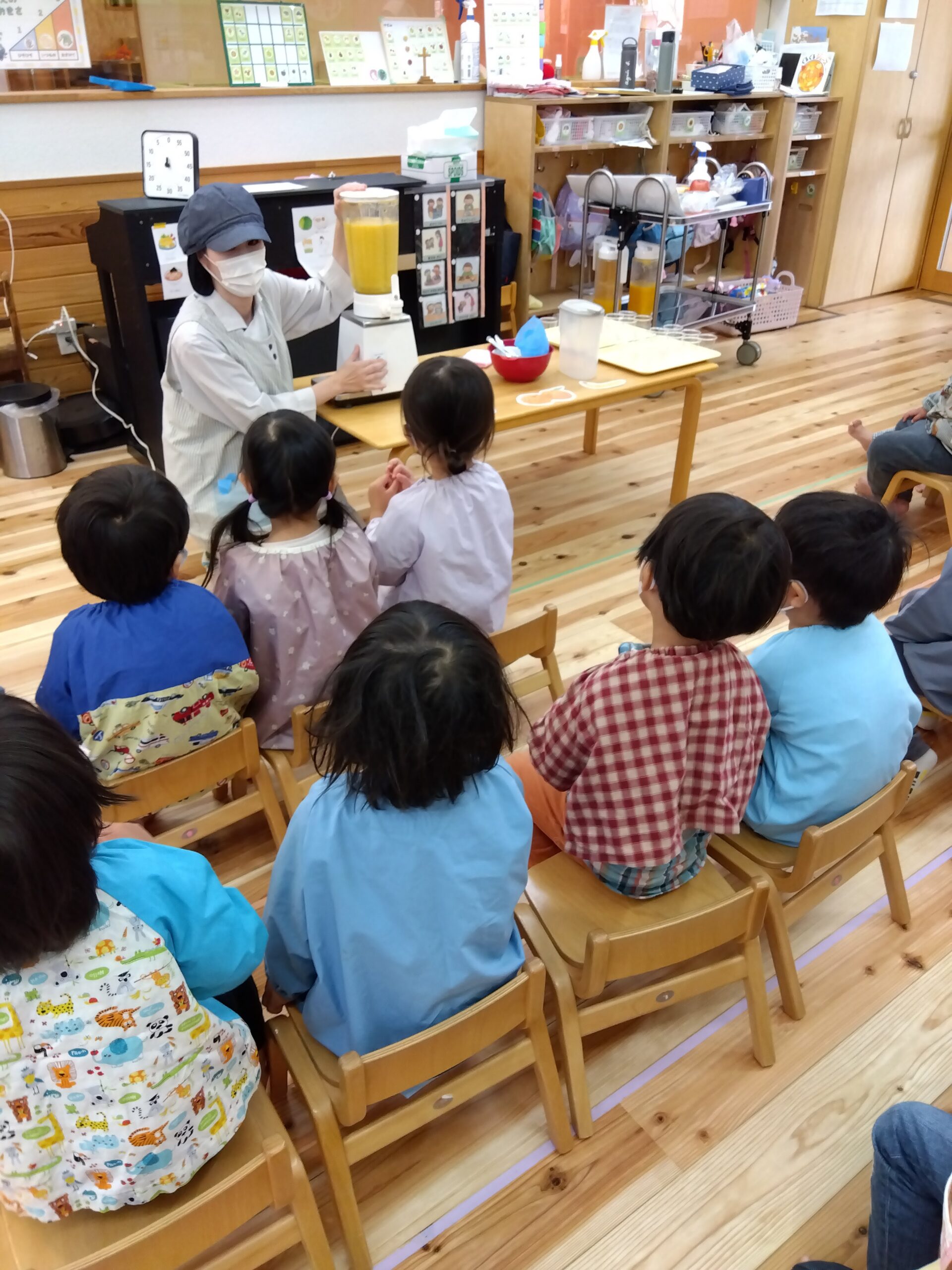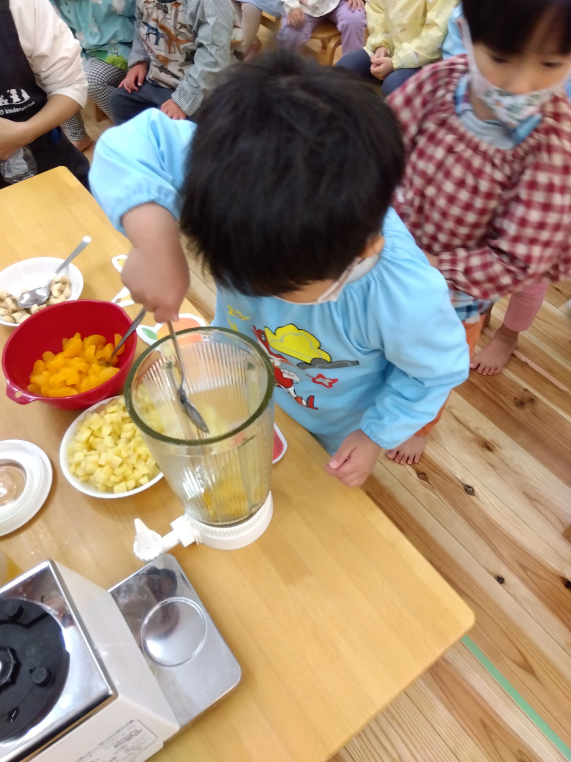 みんなでいつも歌っている「ぼくのミックスジュース」の歌を歌いながら自分たちの手もぐるぐると回して応援し、完成しました♪
