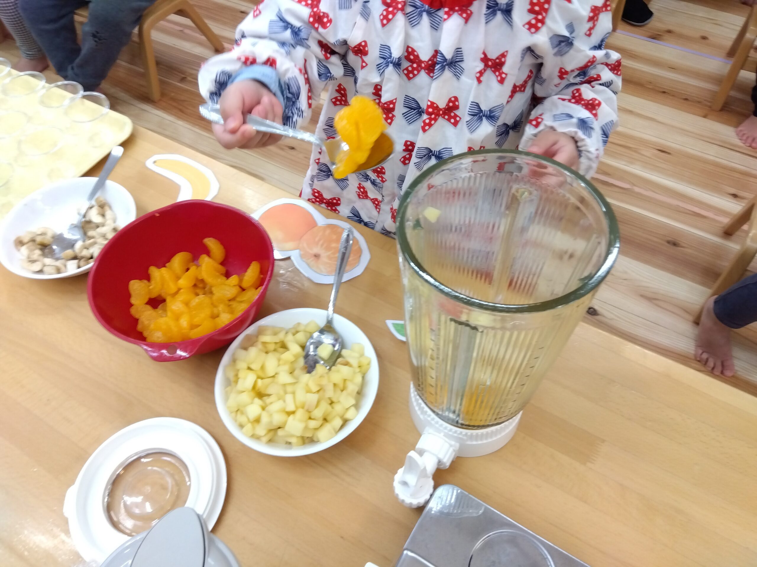 それぞれ好きな果物をスプーンで一杯。だんだん増えていきます。