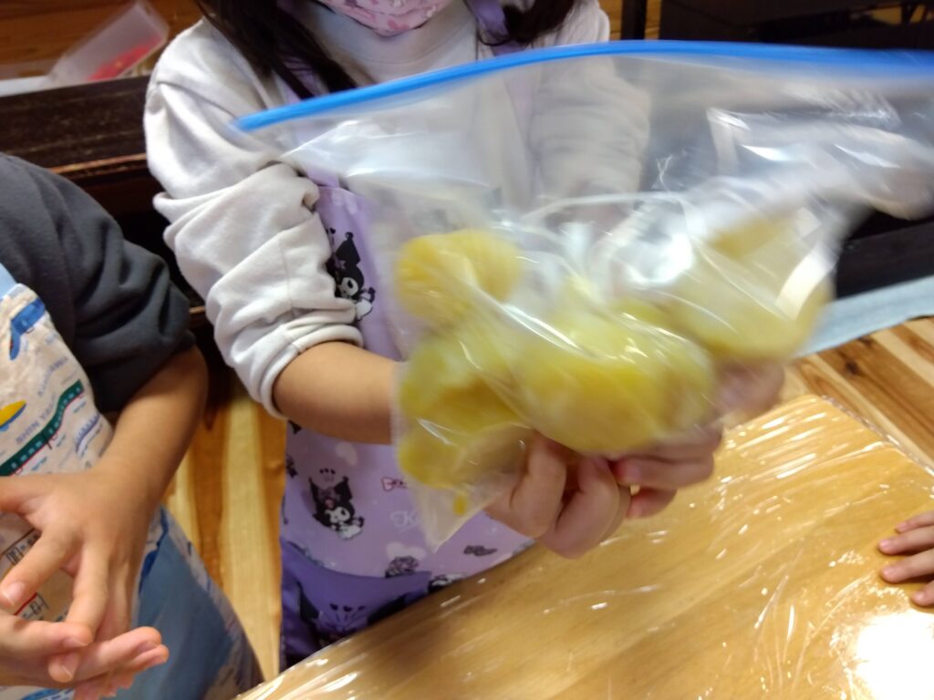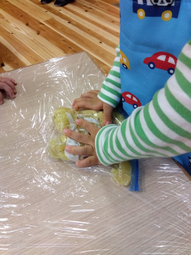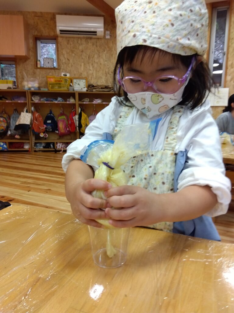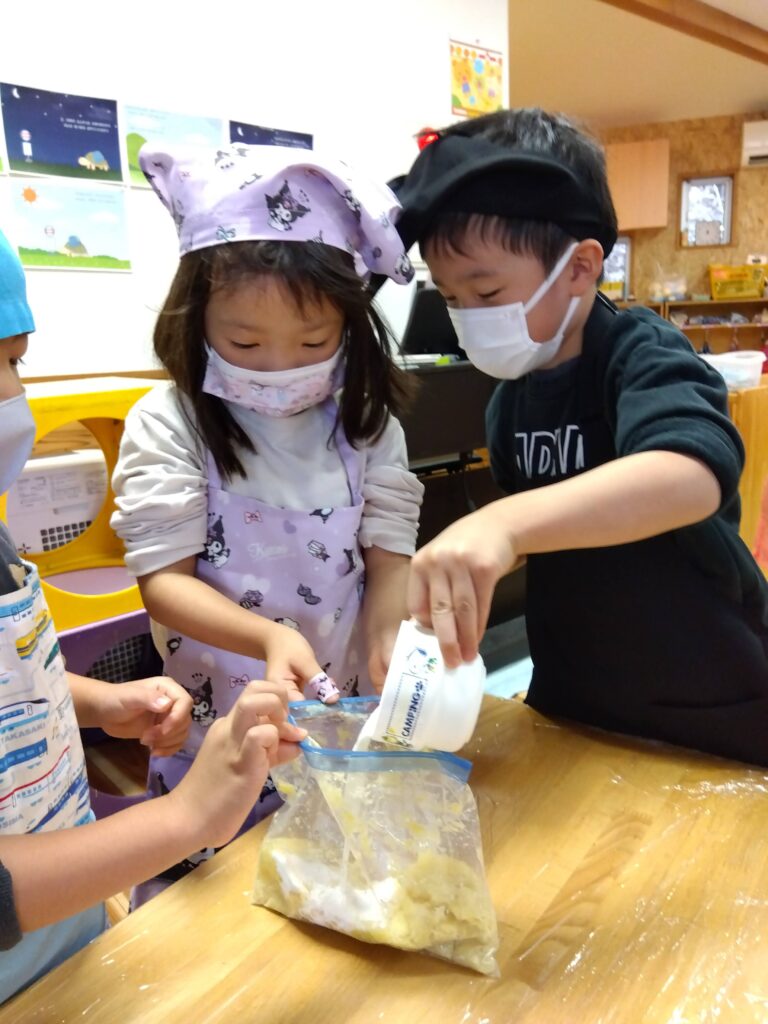 さつまいもをお当番で協力して潰していきます。「さ つ ま い も!」と言葉に合わせて五回ずつ順番に揉み揉み。できたら、牛乳と砂糖を入れて、さらに揉み揉みして完成!