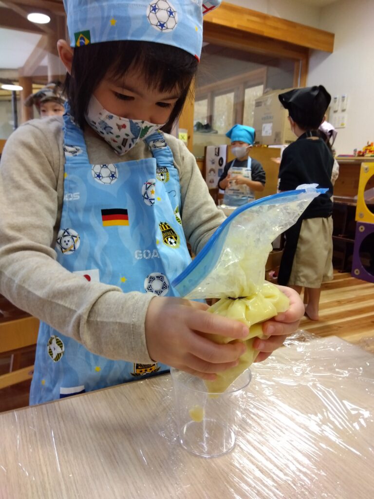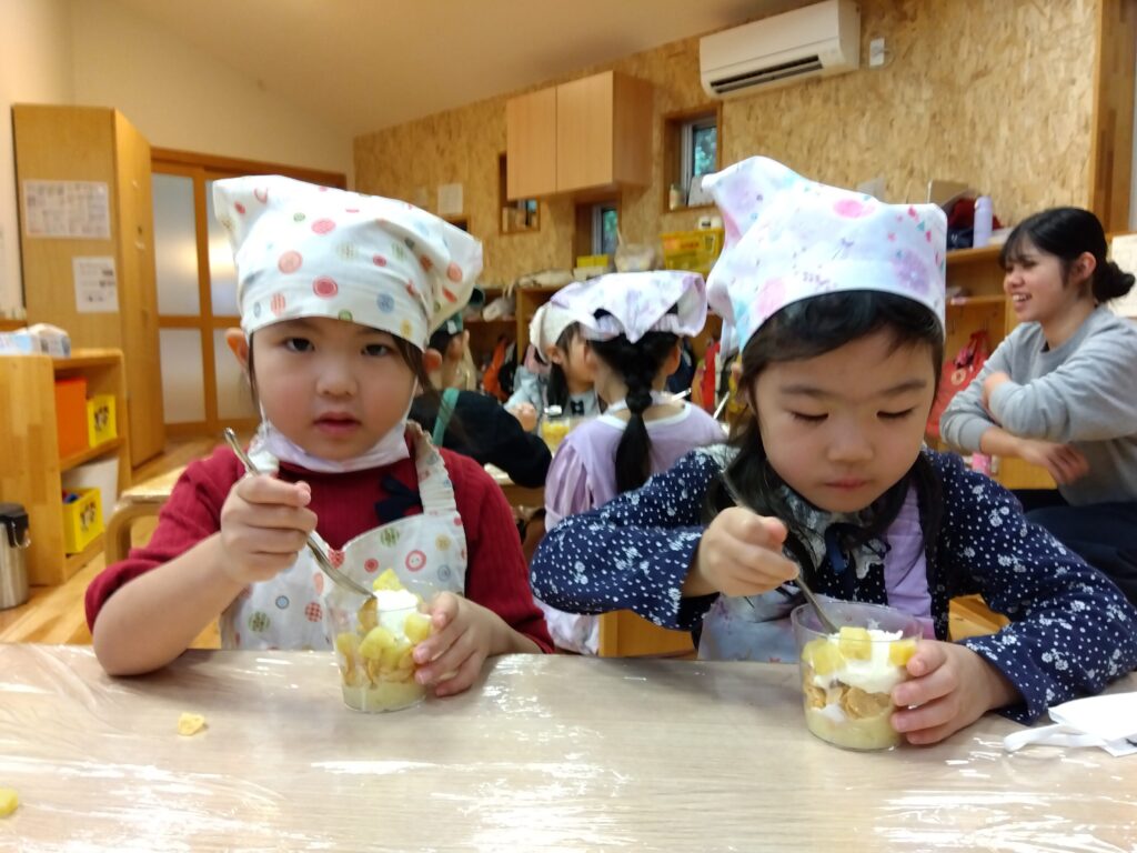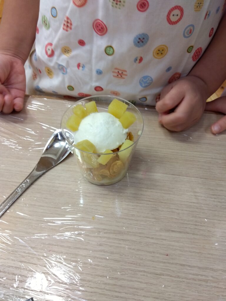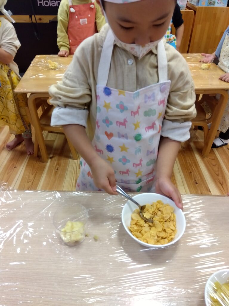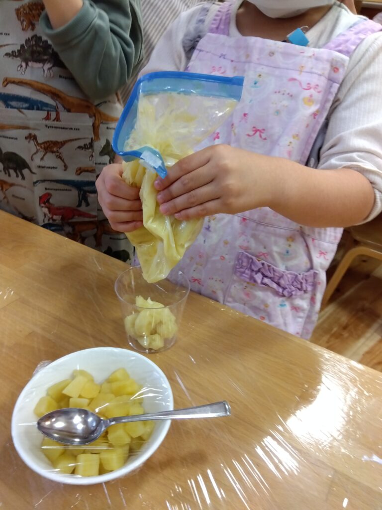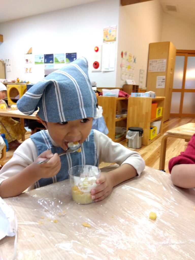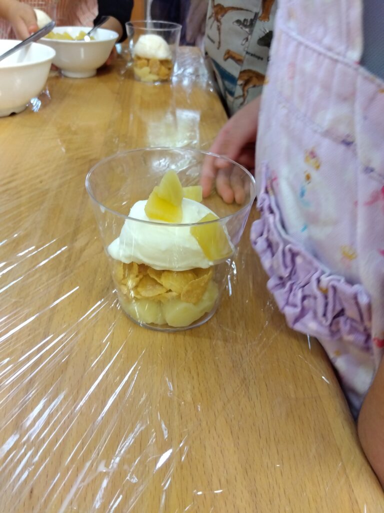 昨日、ぶどう組では食育として「お芋パフェ作り」を行いました。