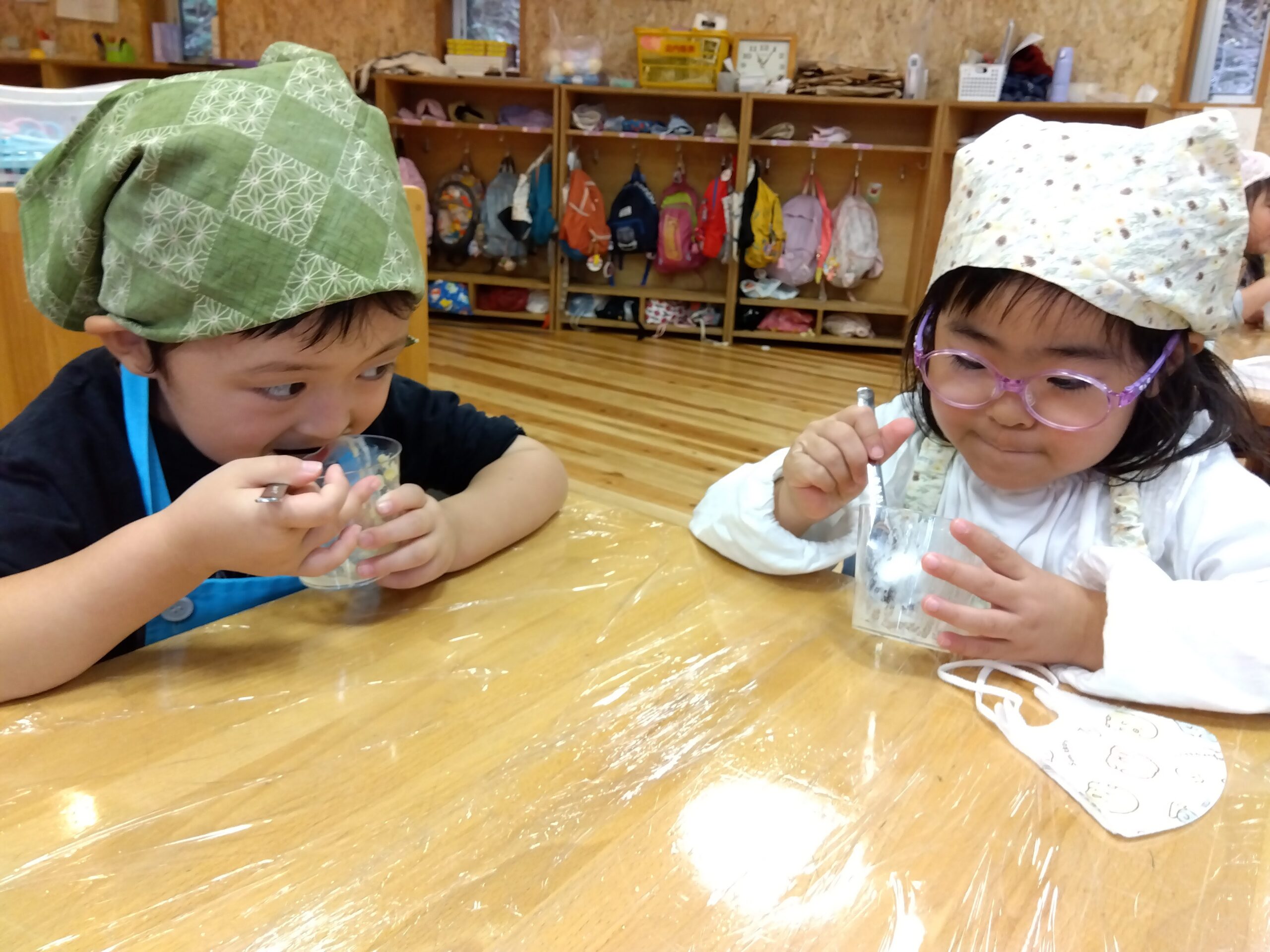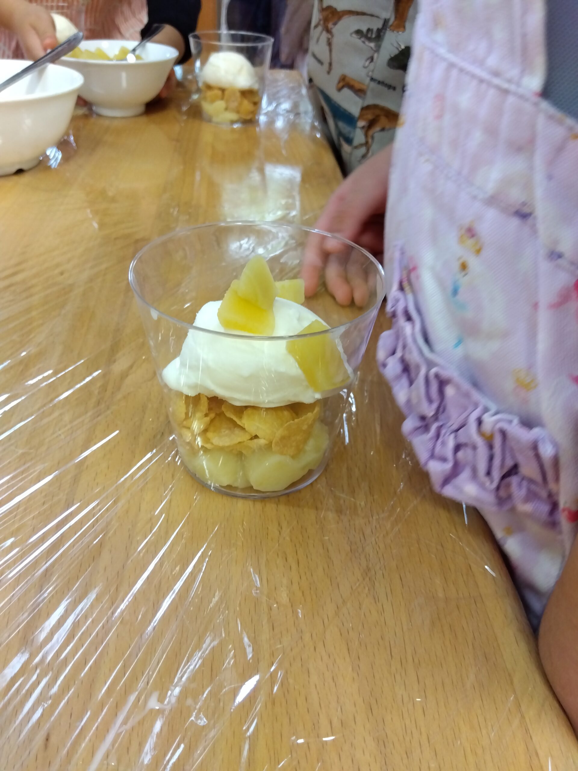 昨日、ぶどう組では食育として「お芋パフェ作り」を行いました。